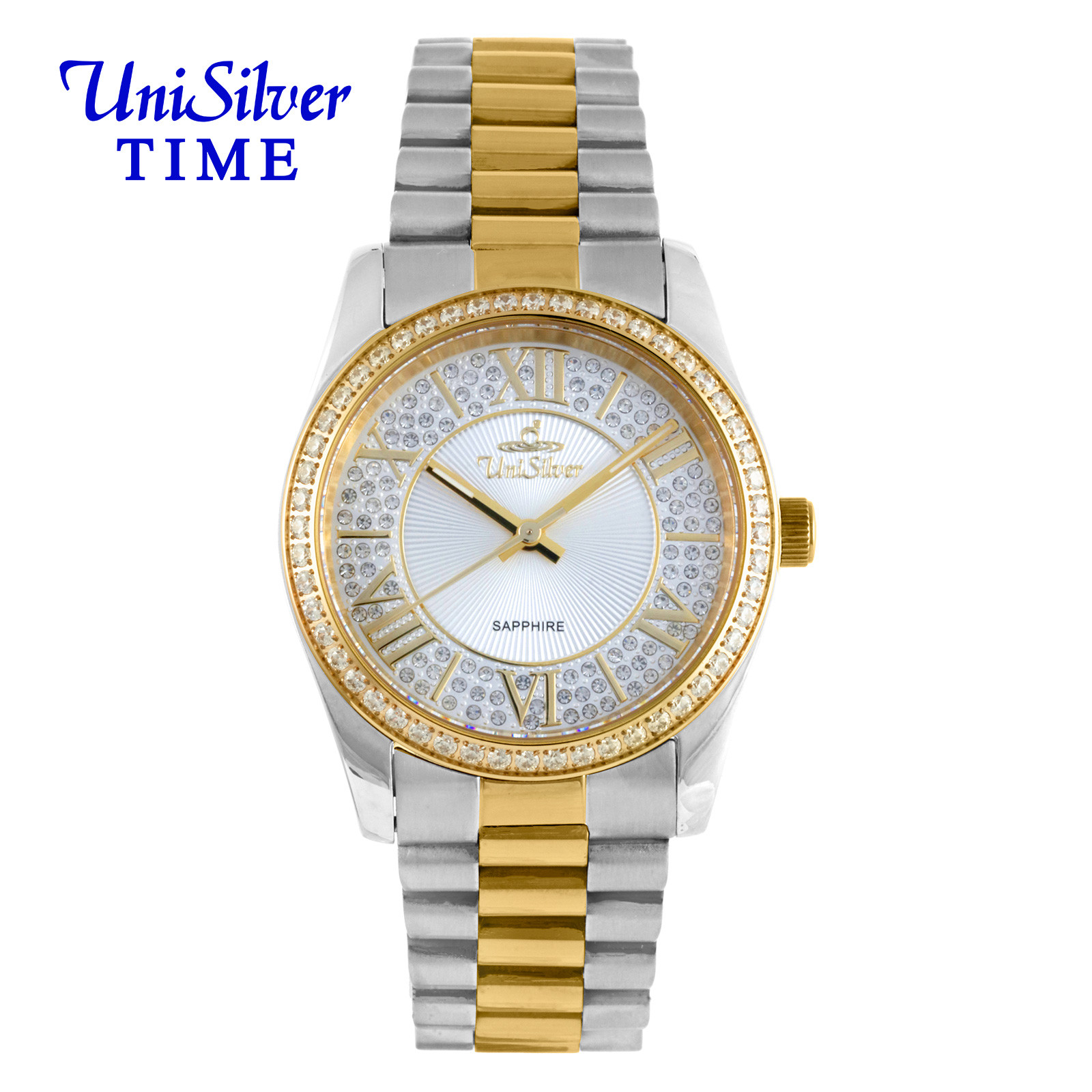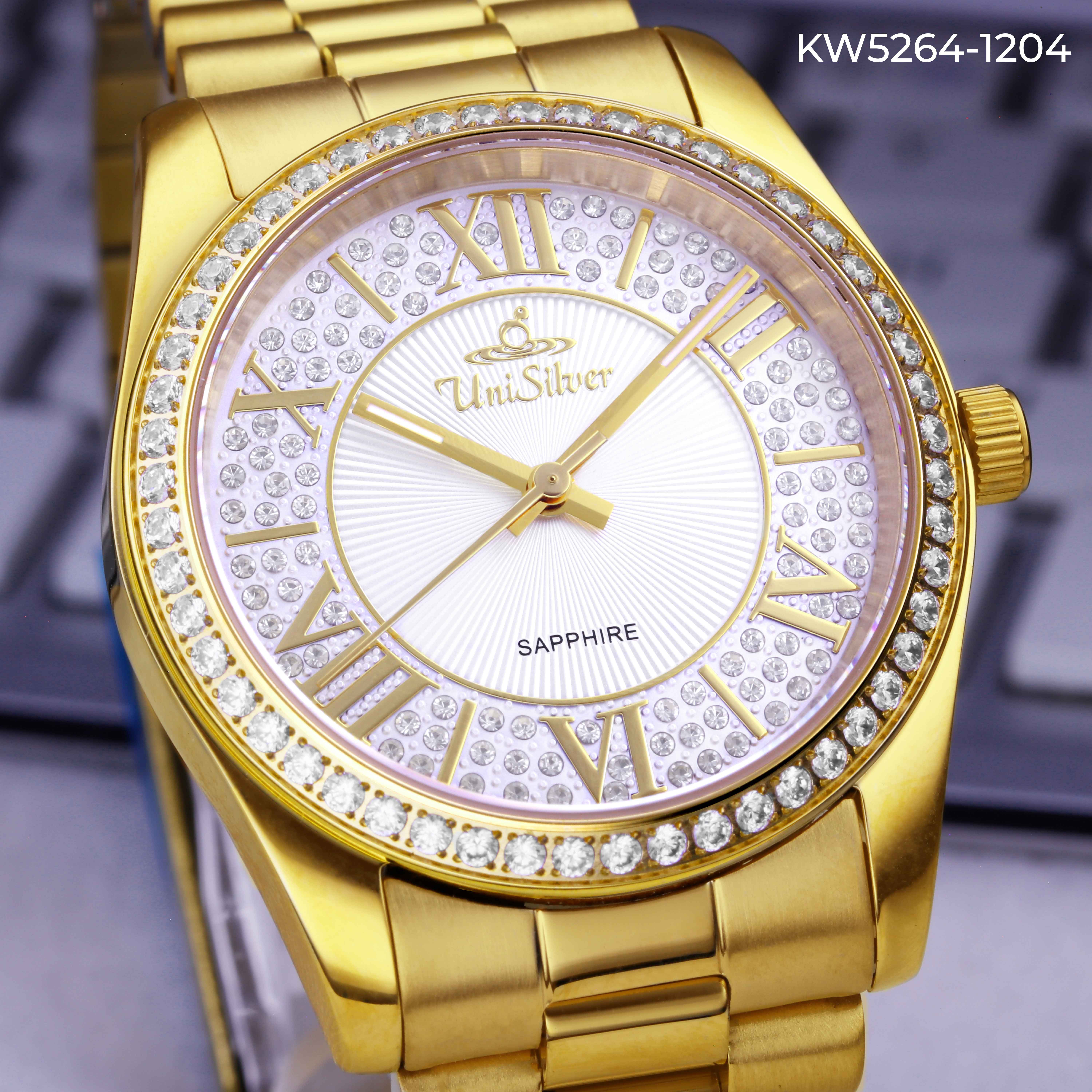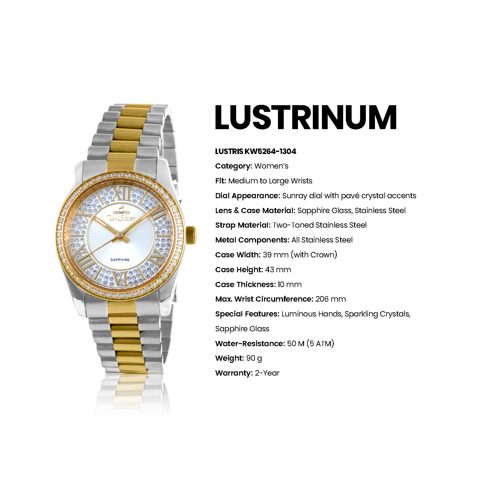 Refine your everyday style with the LUSTRINUM Lustris by Unisilver TIME. Featuring a radiant sunray dial with pavé crystal accents, this timepiece adds subtle brilliance to any look. Crafted with stainless steel, protected by sapphire glass, and powered by reliable Japan movement, it delivers refined design and dependable performance–made for modern women who appreciate timeless elegance.