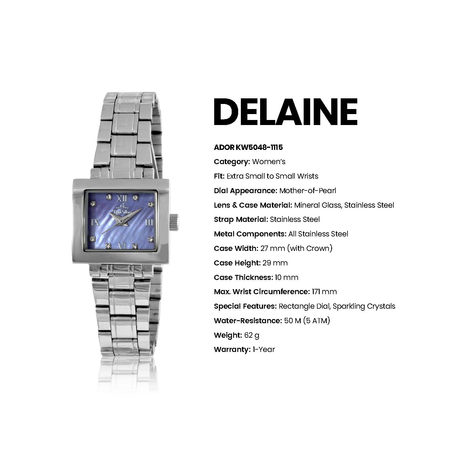 Radiate sophistication with the Delaine Ador timepiece from UniSilver TIME. This gold-plated accessory gleams with its sleek bracelet. The focal point - the off-white dial - sparkles marvelously with crystals for hour indices. The rectangular-shaped dial is the perfect statement for this timeless watch.