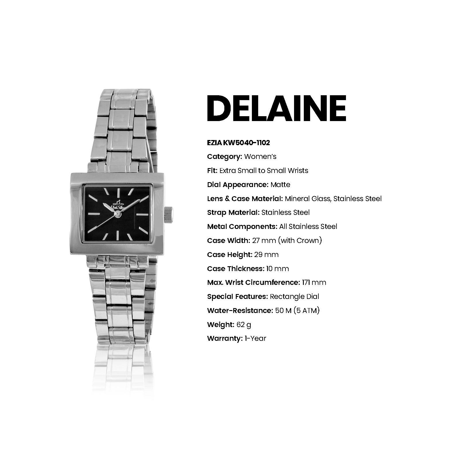 Radiate sophistication with the Delaine Ezia timepiece from UniSilver TIME. This accessory gleams with its sleek bracelet. The rectangular-shaped dial is the perfect statement for this elegant watch.