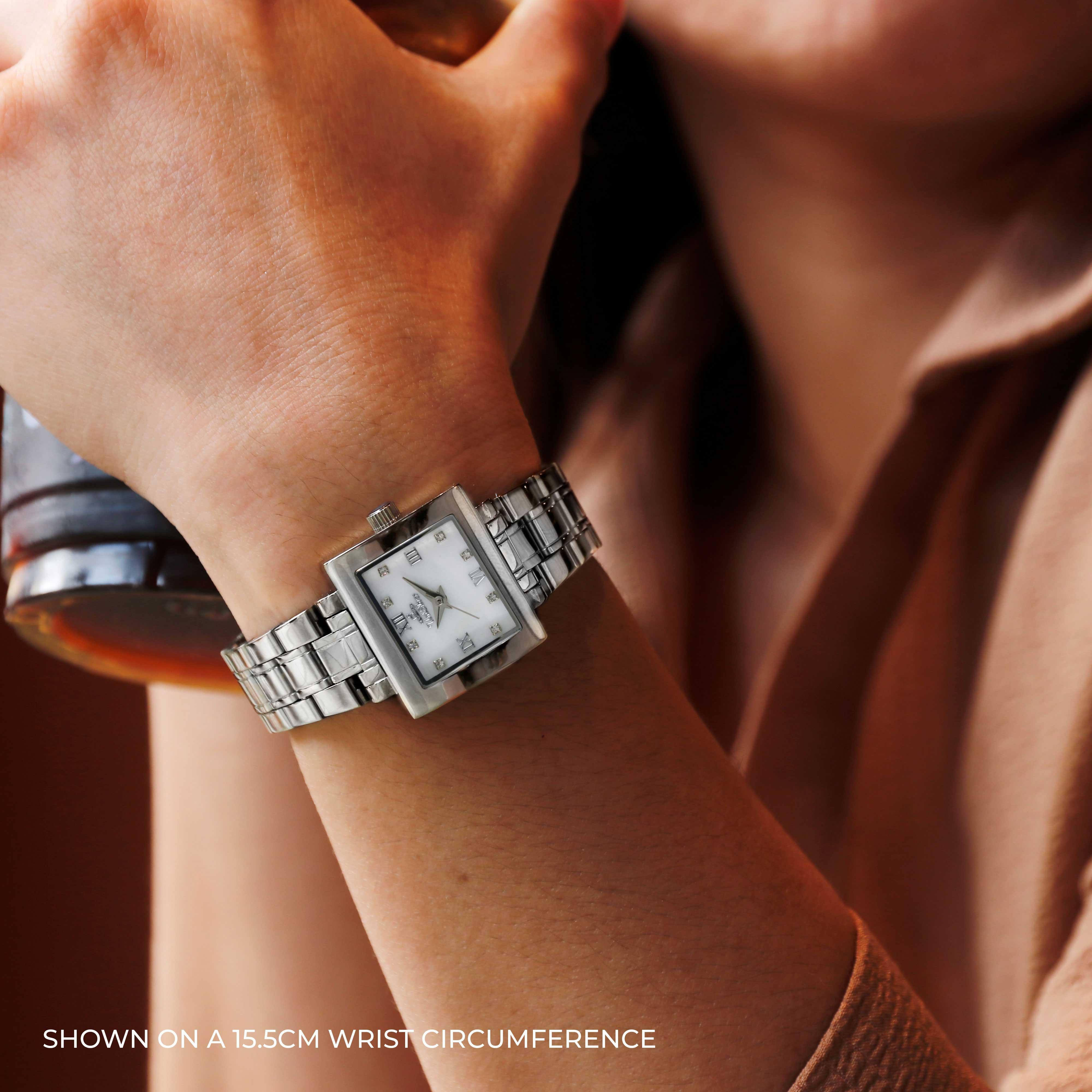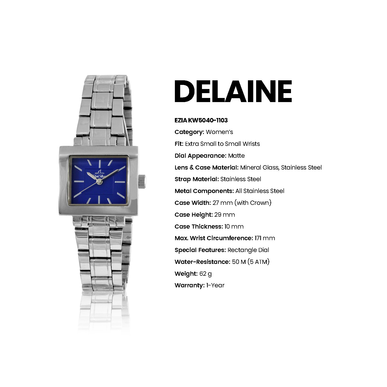 Radiate sophistication with the Delaine Ezia timepiece from UniSilver TIME. This accessory gleams with its sleek bracelet. The rectangular-shaped dial is the perfect statement for this elegant watch.