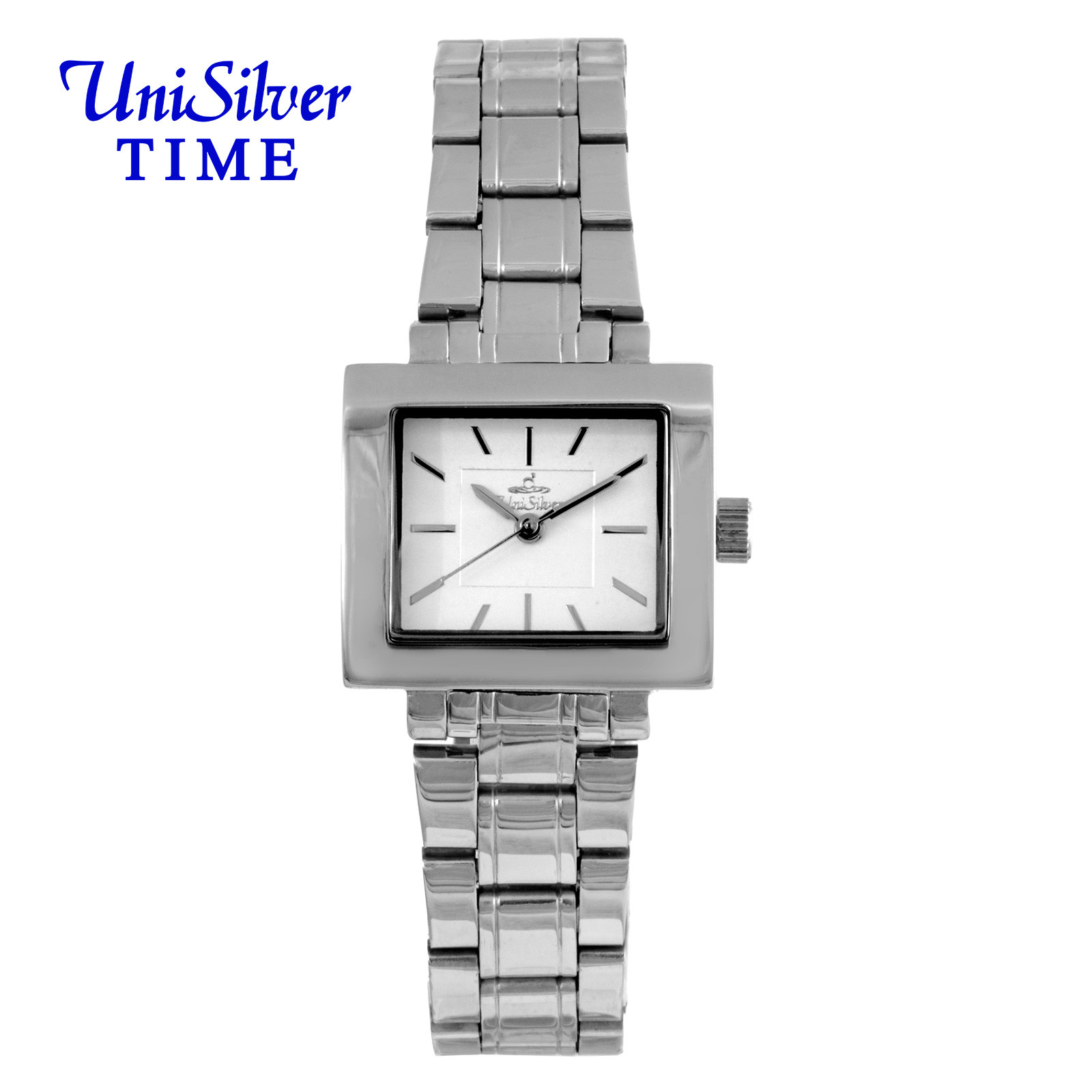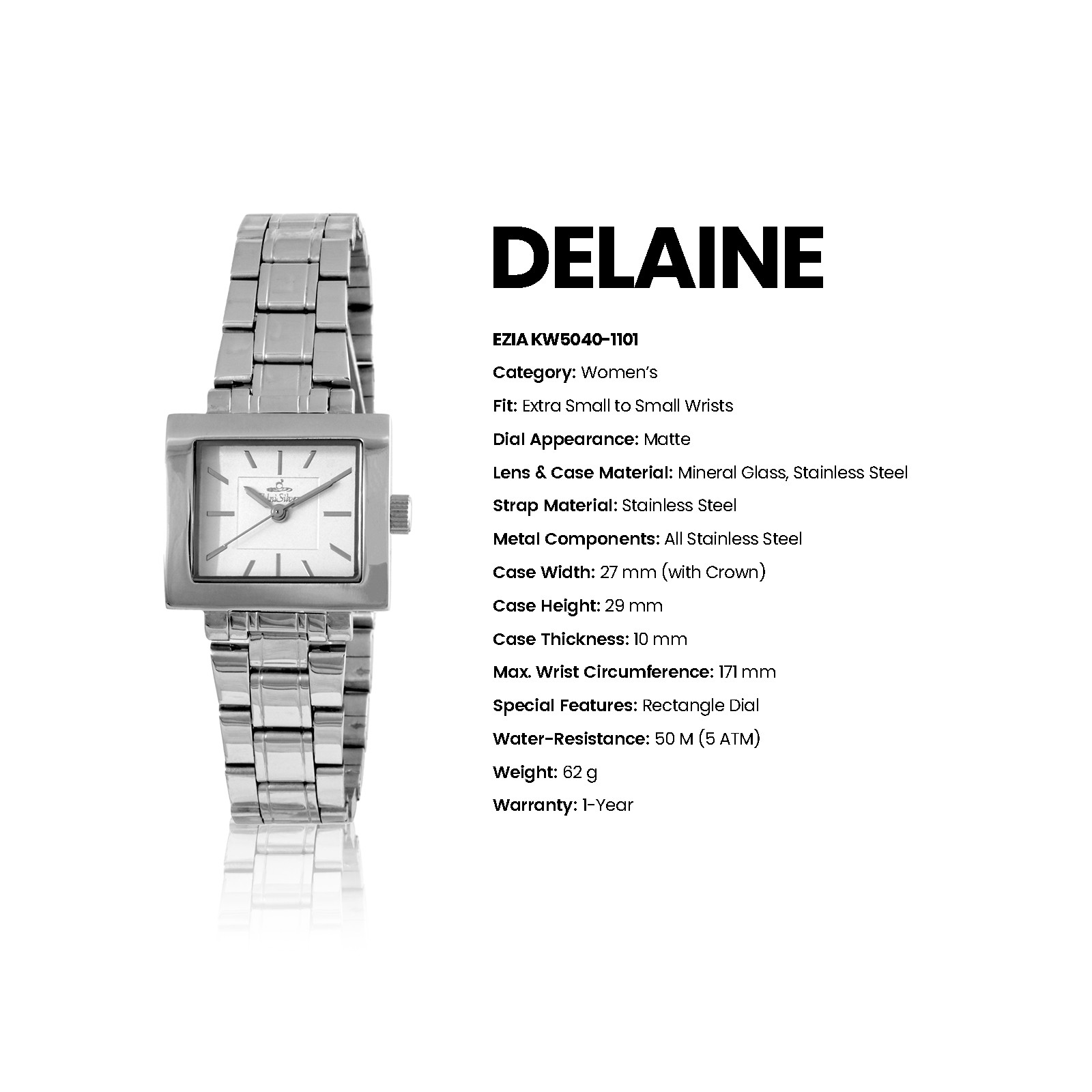 Radiate sophistication with the Delaine Ezia timepiece from UniSilver TIME. This accessory gleams with its sleek bracelet. The rectangular-shaped dial is the perfect statement for this elegant watch.