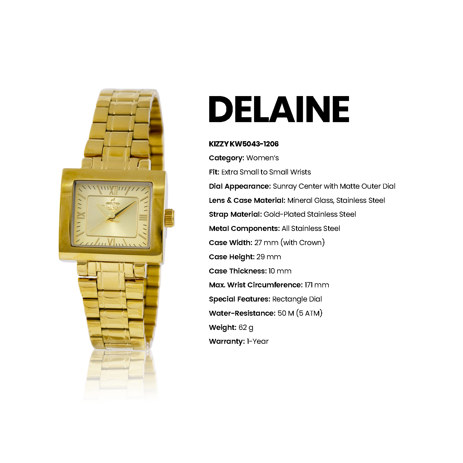 Radiate sophistication with the Delaine Kizzy timepiece from UniSilver TIME. This accessory gleams with its sleek bracelet. The rectangular-shaped dial is the perfect statement for this elegant watch.