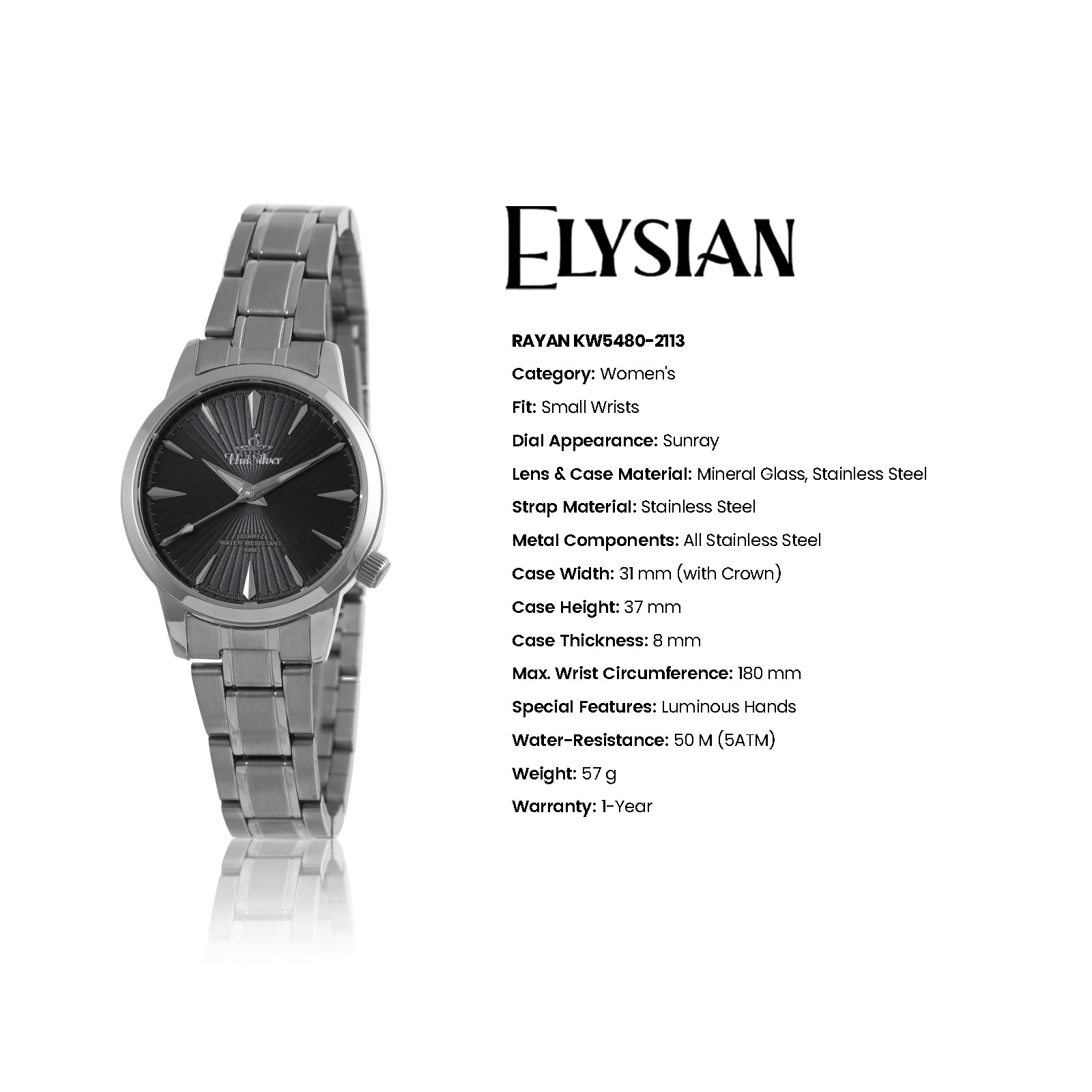 The Elysian Rayan Women’s Watch is a celebration of timeless elegance and graceful design. Crafted with meticulous attention to detail, it embodies sophistication in every element – from its delicate design to its refined finish. This exquisite timepiece transcends fleeting trends, offering a classic charm that enhances any ensemble. More than just a watch, it is a statement of poise and confidence for the woman who appreciates true luxury.