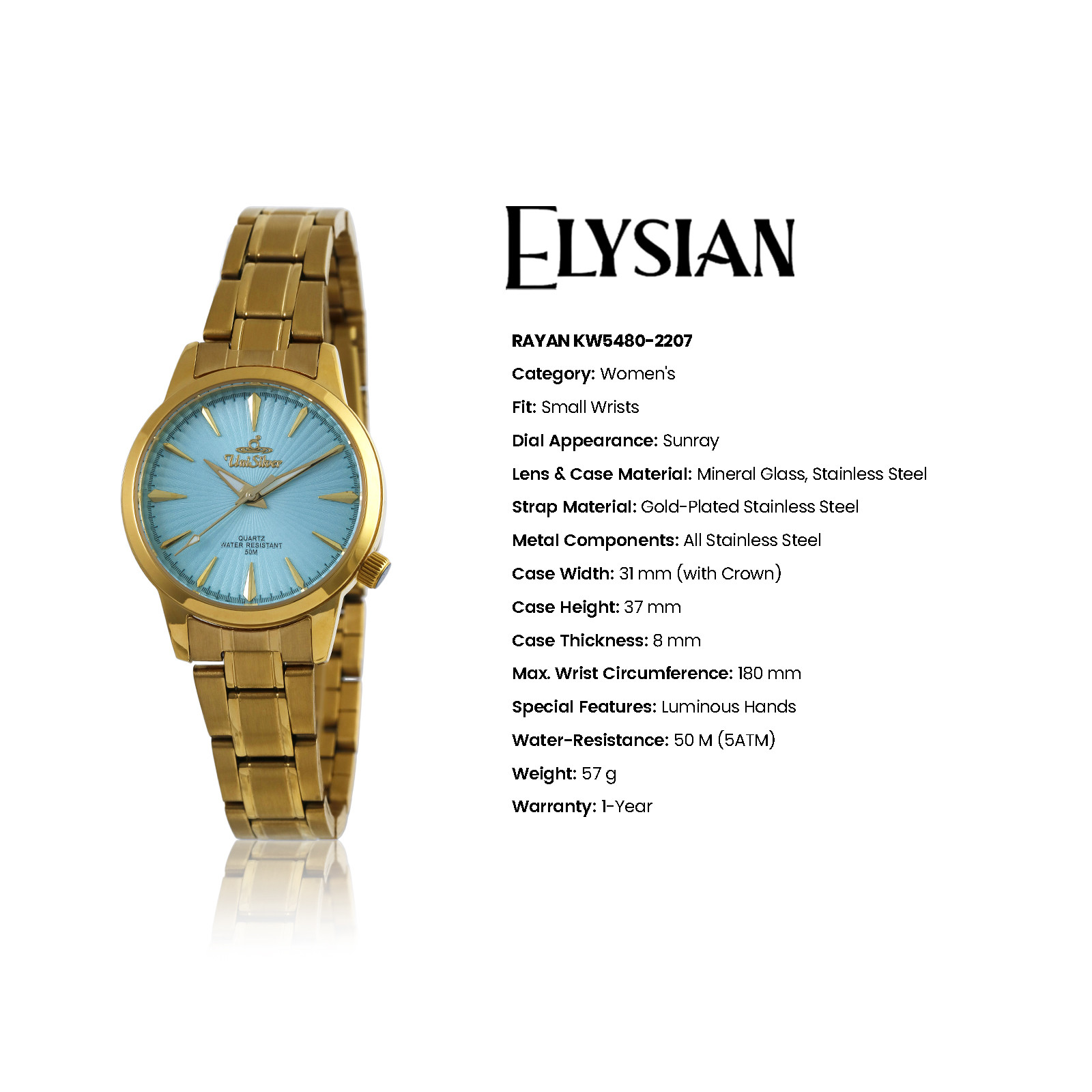 The Elysian Rayan Women’s Watch is a celebration of timeless elegance and graceful design. Crafted with meticulous attention to detail, it embodies sophistication in every element – from its delicate design to its refined finish. This exquisite timepiece transcends fleeting trends, offering a classic charm that enhances any ensemble. More than just a watch, it is a statement of poise and confidence for the woman who appreciates true luxury.