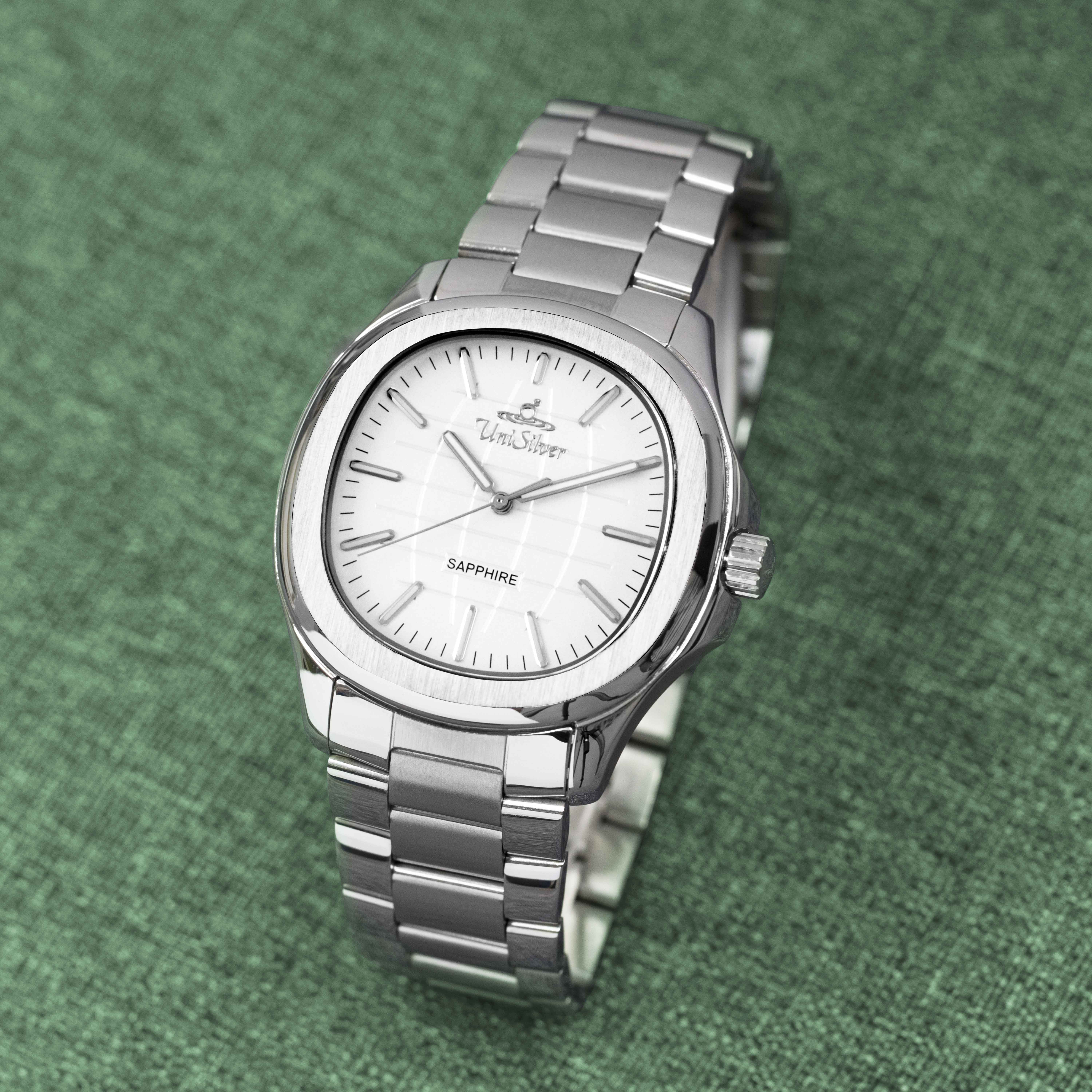 The UniSilver TIME Quantro Enoch men’s watch showcases timeless sophistication with a clean white analog dial housed in a distinctive square case. Crafted entirely from silver stainless steel, it delivers durability with a sleek, modern appeal.