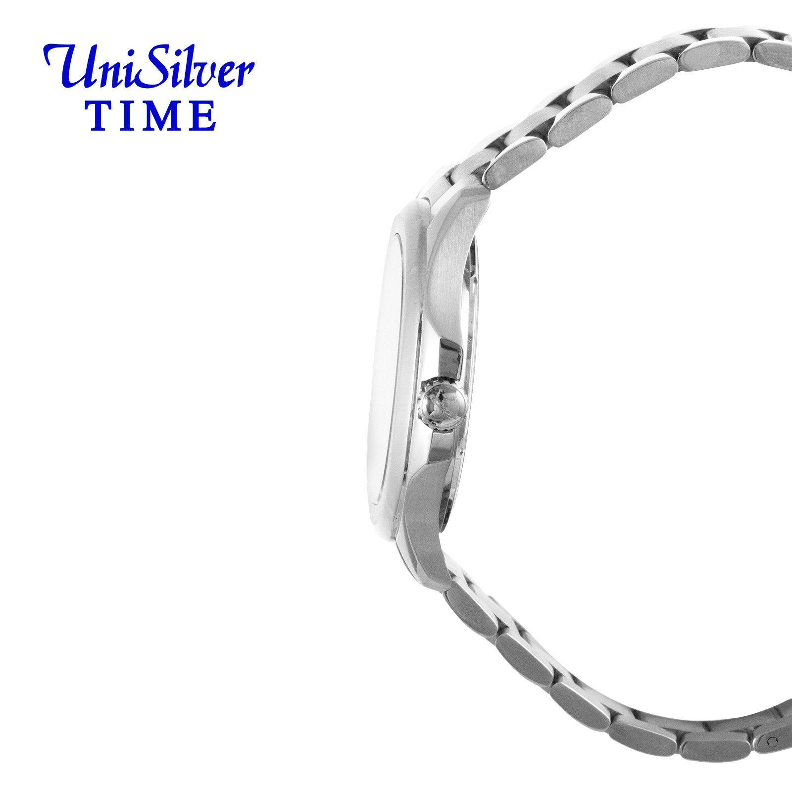 The UniSilver TIME Quantro Enviri men’s watch showcases timeless sophistication with a clean white analog dial housed in a distinctive square case. Crafted entirely from silver stainless steel, it offers both durability and a sleek, modern appeal. A scratch-resistant sapphire crystal protects the dial, ensuring long-lasting clarity and resilience through everyday wear. Designed to transition effortlessly from formal settings to casual occasions, the Quantro is a statement of understated elegance and dependable craftsmanship.