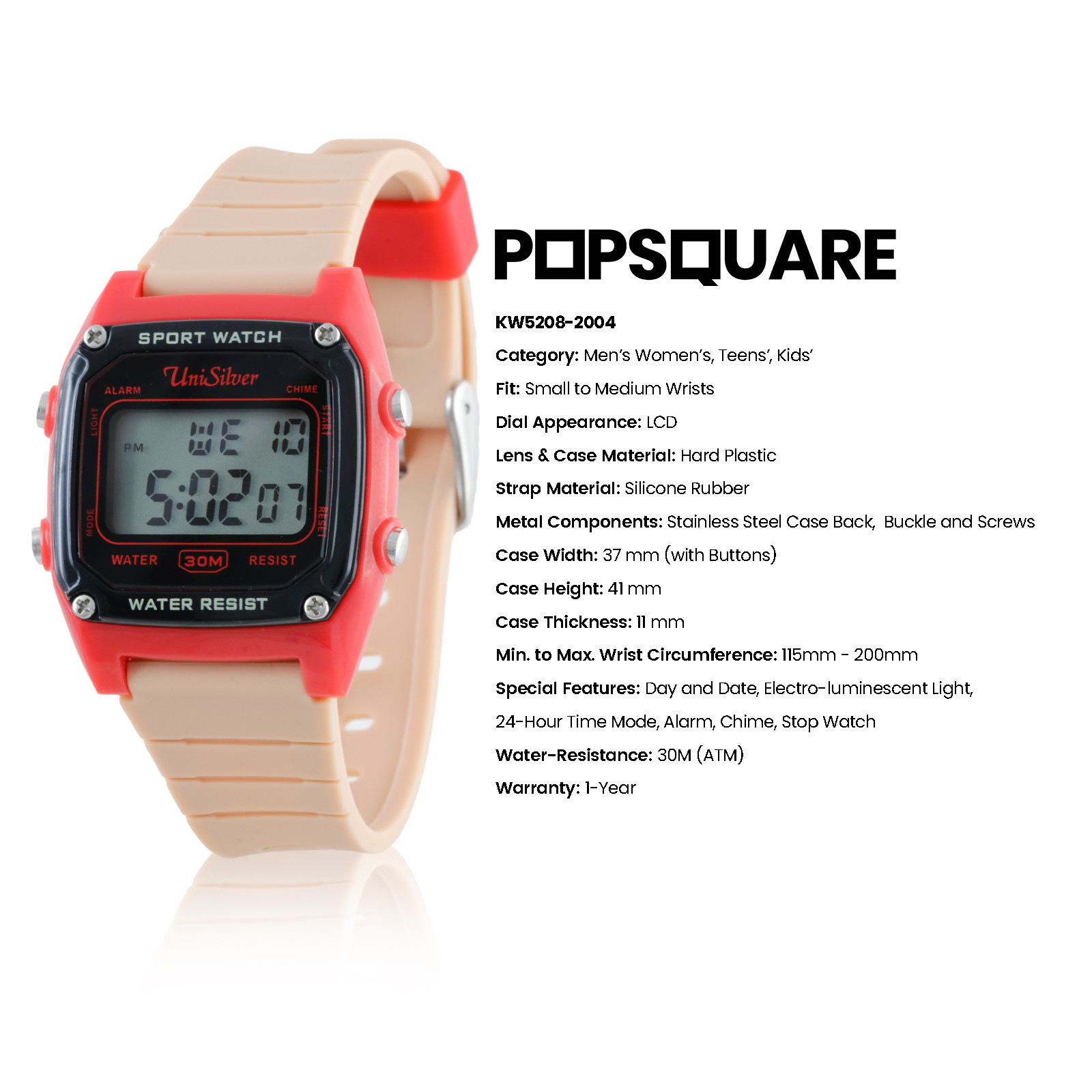 The PopSquare digital watch by UniSilver TIME is a modern, playful watch with a bold square design, made for everyday casual wear. Its sleek and vibrant look makes it easy to style with any outfit, whether you’re heading out for fun with friends, enjoying weekend adventures, or just adding a pop of personality to your day. Durable and comfortable, it’s designed to be a reliable companion for all your daily moments.