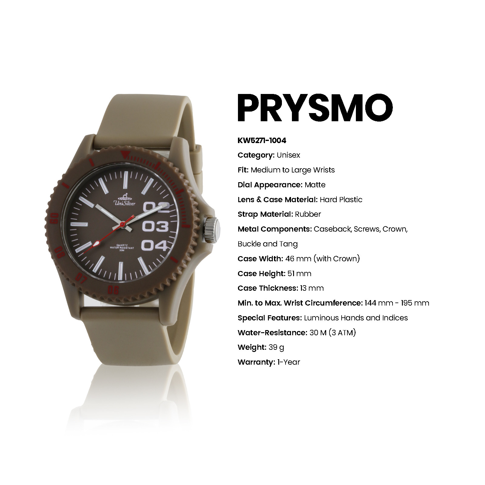 Step into everyday reliability with the Prysmo timepiece, crafted for those who value both function and style. Designed for medium to large wrists, this unisex watch features a bold case and a durable rubber strap for all-day comfort. Its precise Japan movement ensures accurate timekeeping, while luminous hands and indices provide easy readability even in low light. Built with sturdy materials and water resistance up to 30 meters, this watch is a dependable companion for everyday wear and casual occasions.