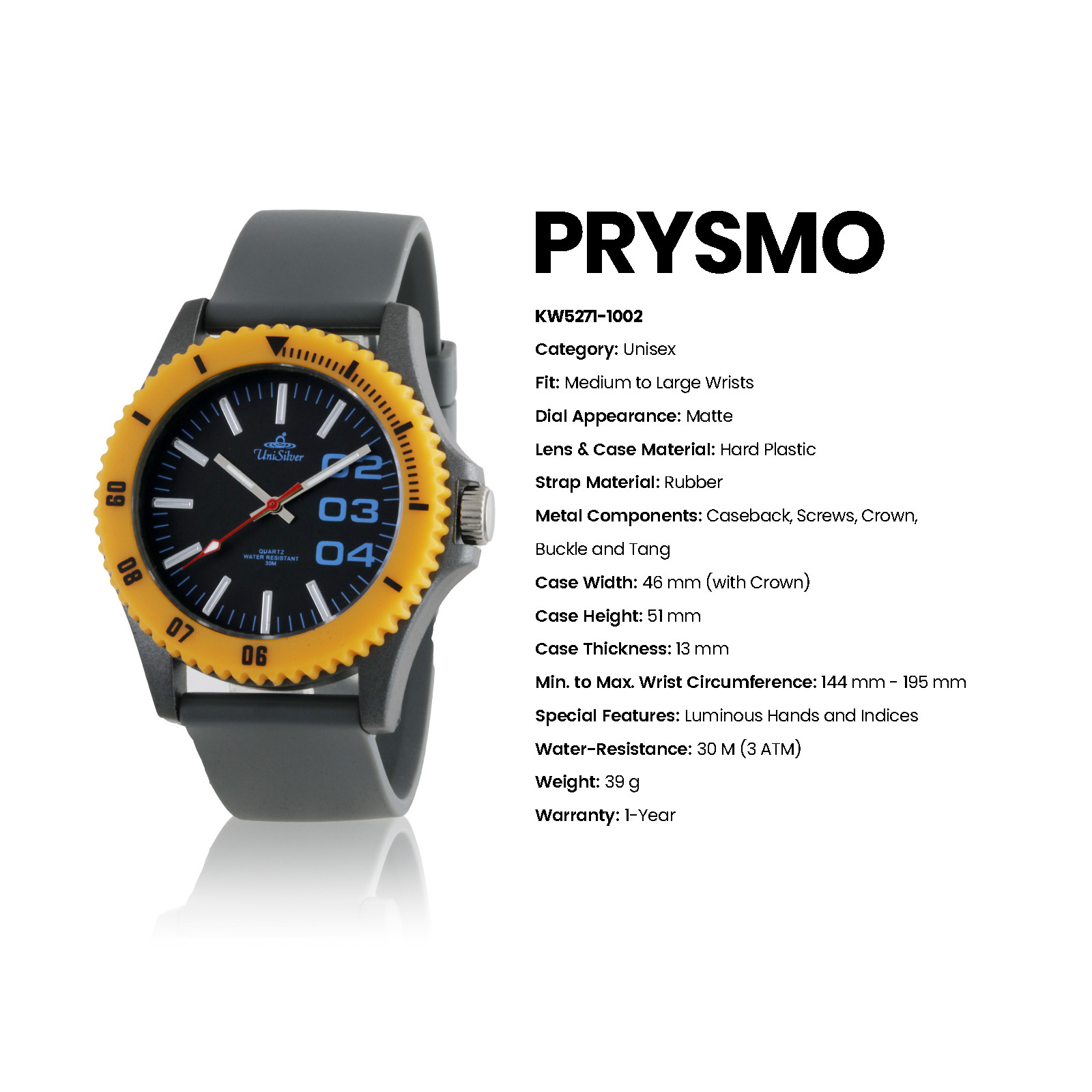 Step into everyday reliability with the Prysmo timepiece, crafted for those who value both function and style. Designed for medium to large wrists, this unisex watch features a bold case and a durable rubber strap for all-day comfort. Its precise Japan movement ensures accurate timekeeping, while luminous hands and indices provide easy readability even in low light. Built with sturdy materials and water resistance up to 30 meters, this watch is a dependable companion for everyday wear and casual occasions.