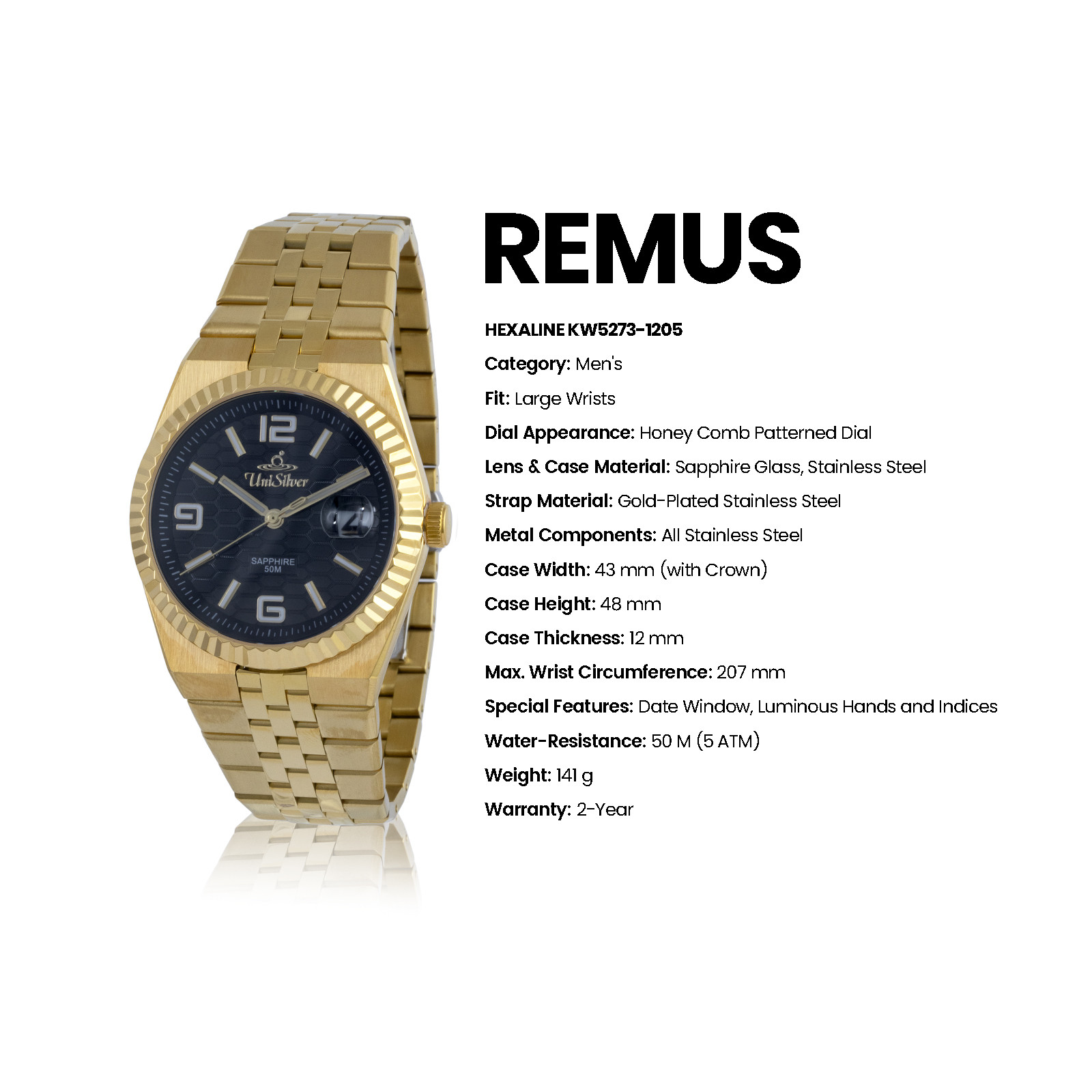 With luminous hands, a practical date window, and 50M water resistance, the Remus Hexaline easily moves from day-to-day wear to more refined occasions.