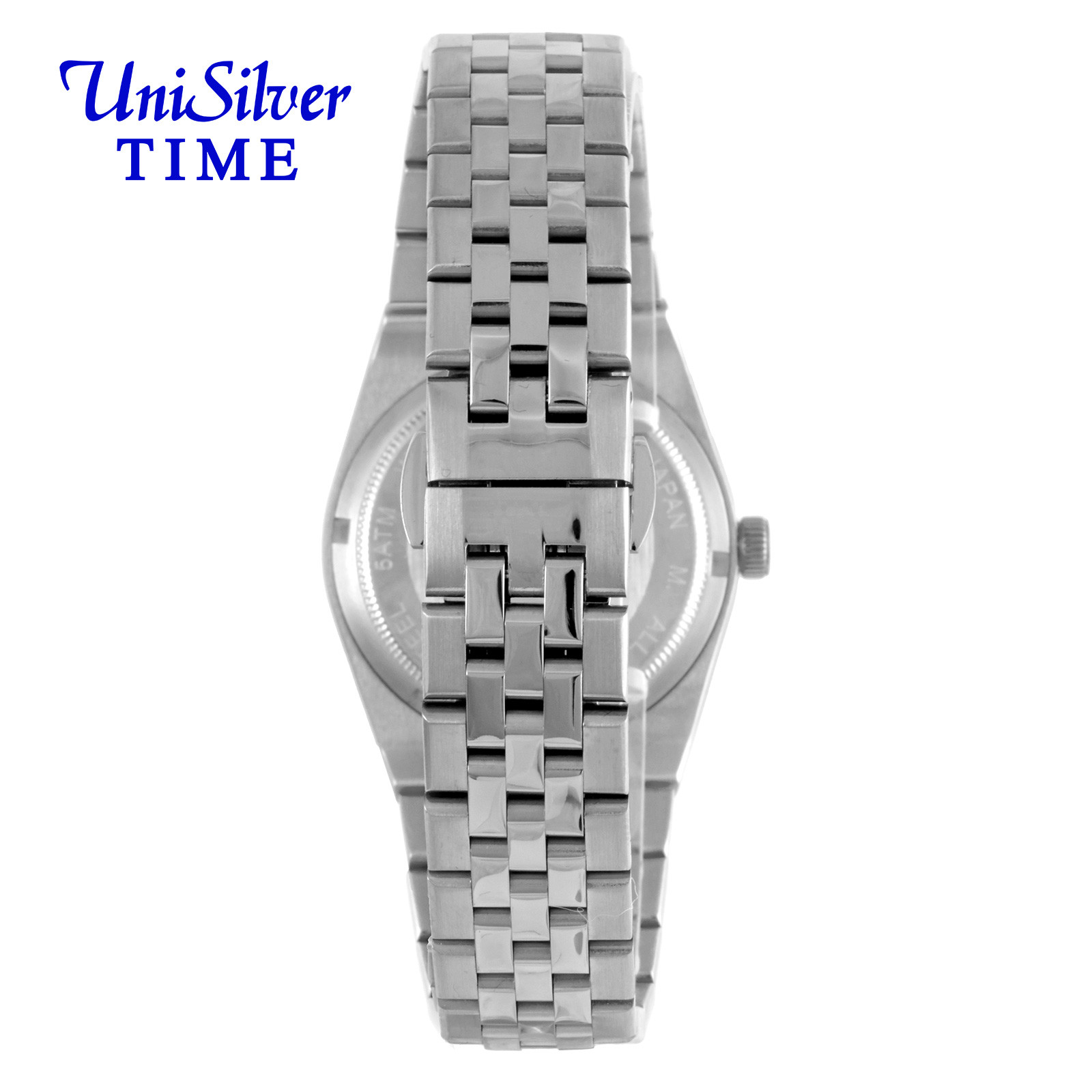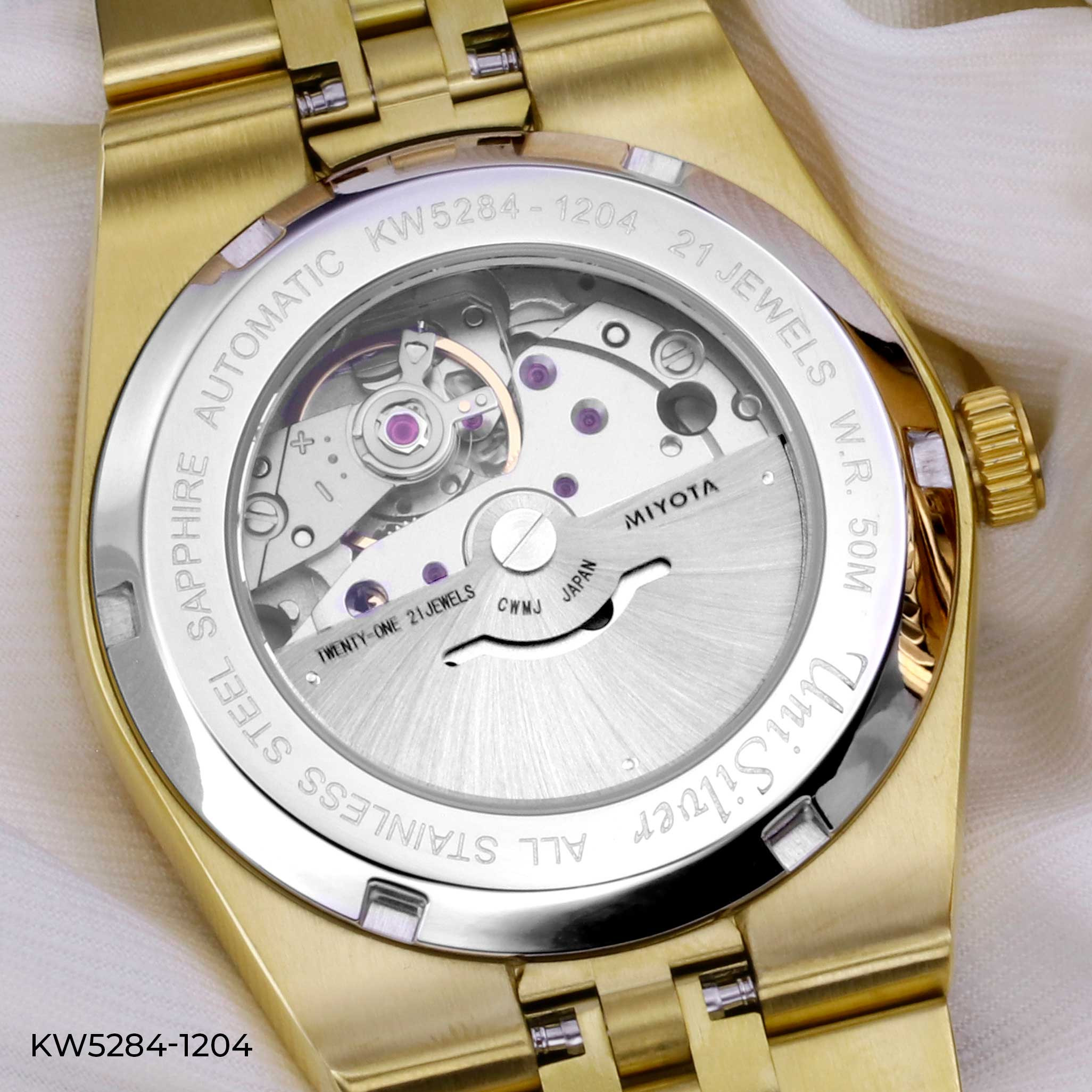 Powered by a self-winding 21-jewel movement and showcased through a transparent case back, it delivers reliable, battery-free performance. Built with durable stainless steel and scratch-resistant sapphire glass, it’s made for everyday wear.