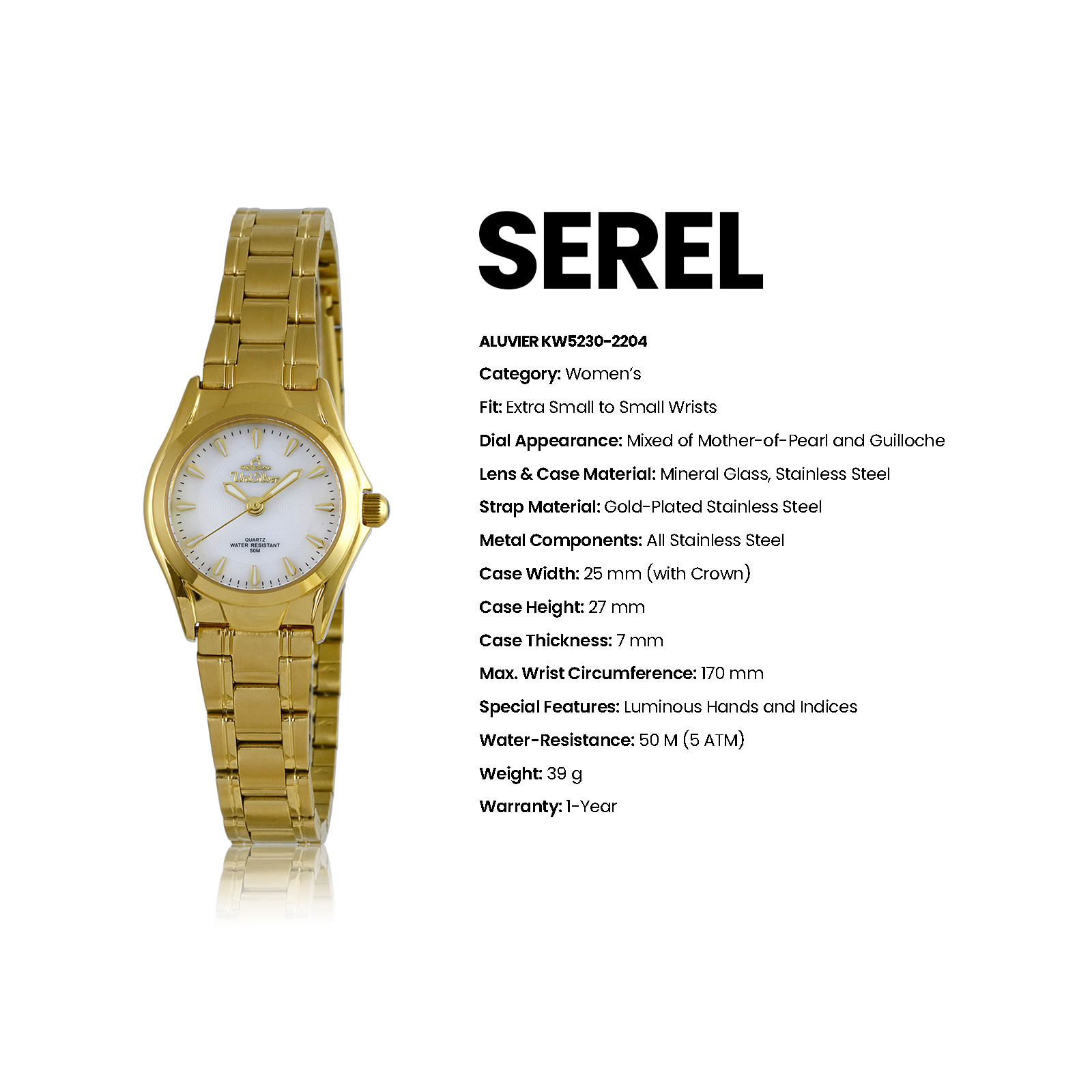 With its luminous hands, mother-of-pearl dial and refined detailing, Aluvier brings quiet sophistication to every moment. Powered by reliable Japan movement and crafted in stainless steel with 50M water resistance, it’s designed to shine effortlessly from day to night.