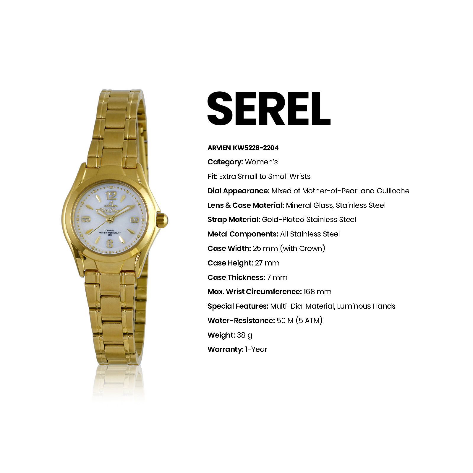 With its luminous hands, mother-of-pearl dial and refined detailing, Arvien brings quiet sophistication to every moment. Powered by reliable Japan movement and crafted in stainless steel with 50M water resistance, it’s designed to shine effortlessly from day to night.